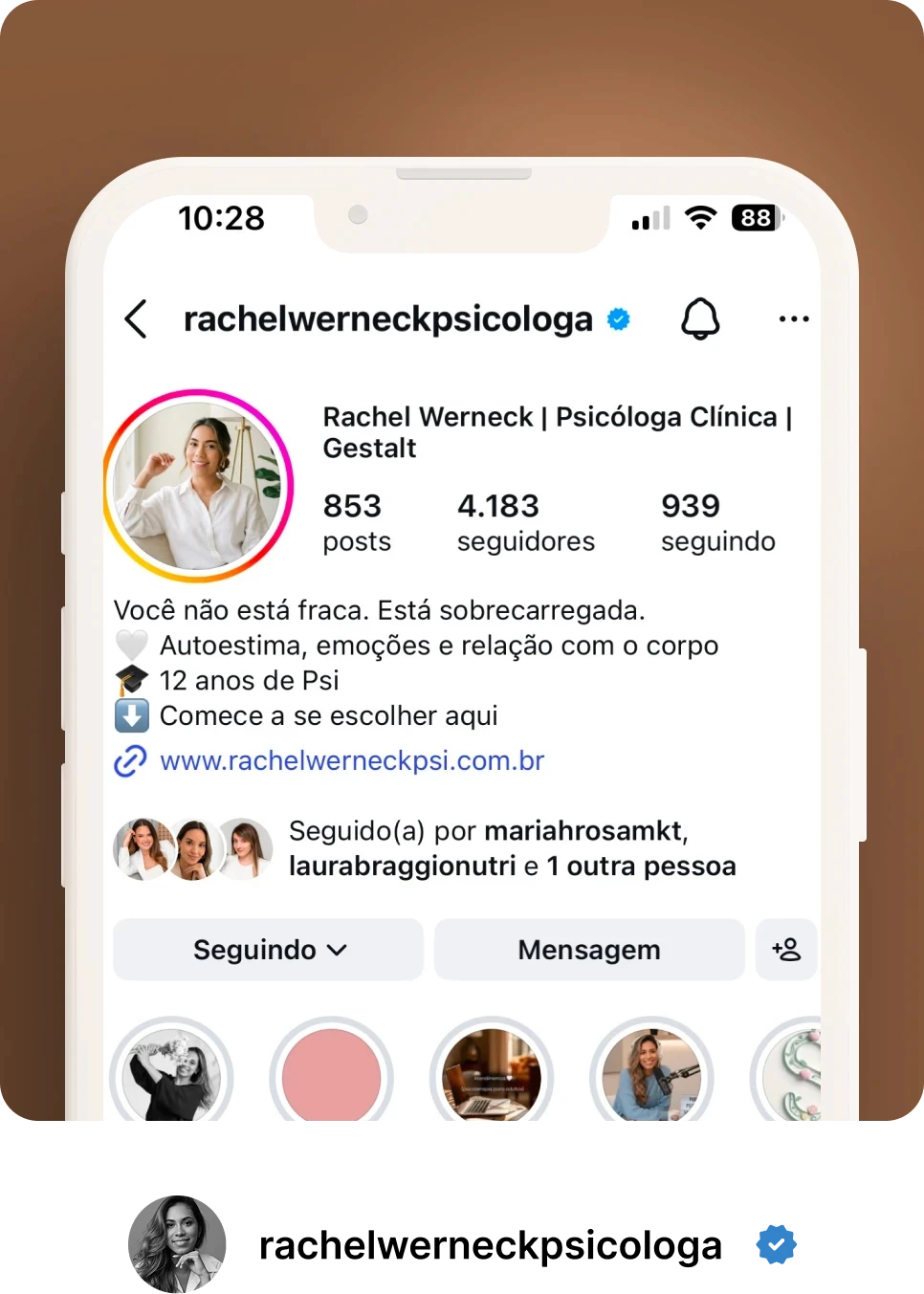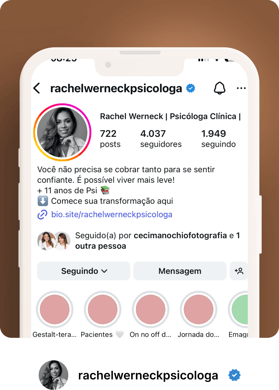 Minha motivação vem daí: ajudar pessoas que se cobram demais, que sentem que nunca são suficientes e que precisam resgatar uma relação mais amorosa consigo mesmas. Acredito que cada conquista é mais sólida quando nasce do olhar gentil que temos sobre nós.